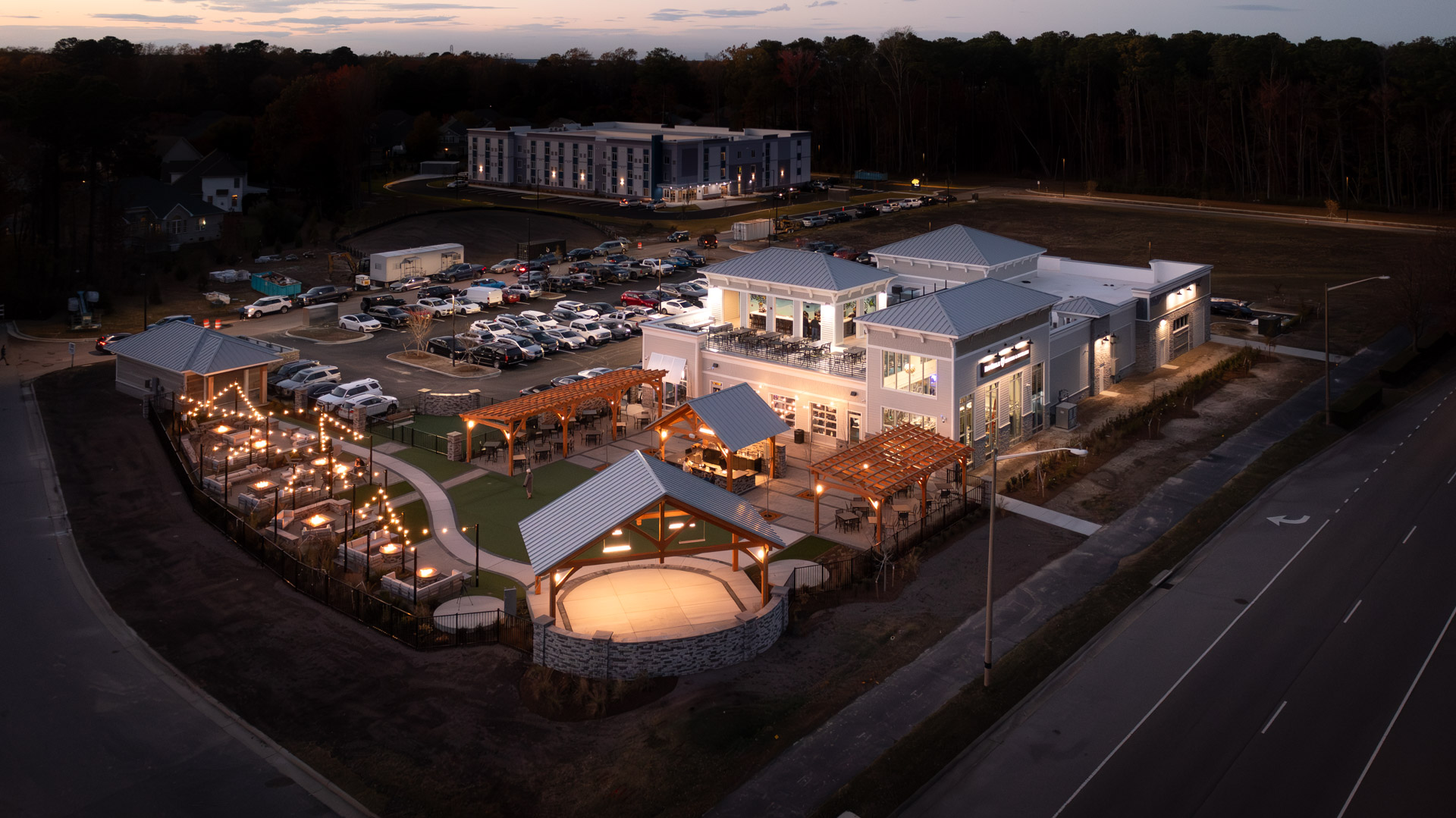 The facility brings together a state-of-the-art brewery, distillery, restaurant, music venue, and ABC store under one roof. Guests can enjoy craft beer and spirits, elevated cuisine, live music, outdoor seating, and a rooftop bar with sweeping views of the beer garden and concert stage, making it a standout destination in Hampton Roads.