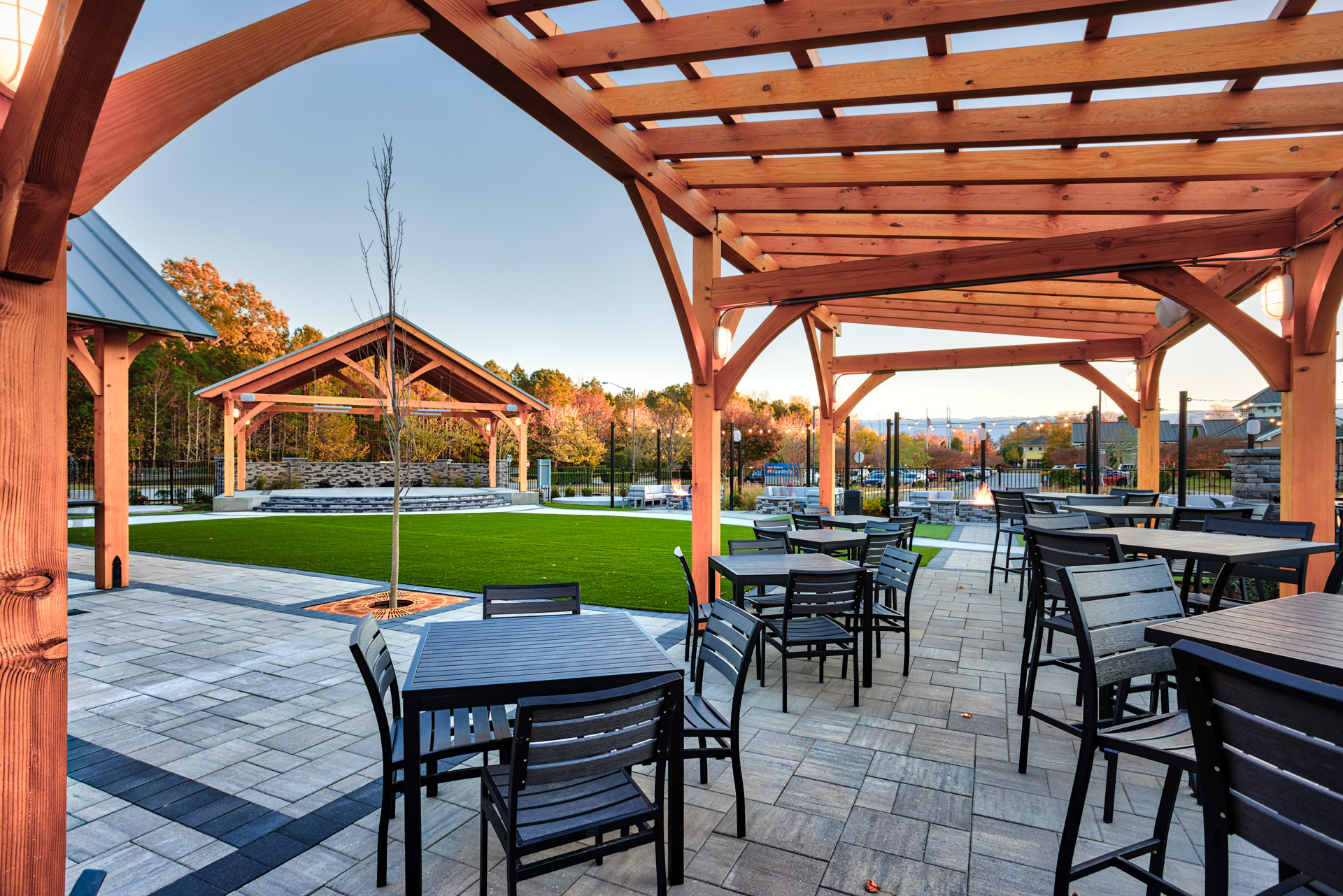 Two of their signature structures, the Boulder Timber Frame Pergola and the Kingston Pro Timber Frame Pavilion, were thoughtfully paired at New Realm Brewing. The Boulder Pergola offers bold beams and an open, architectural design that provides partial shade while maintaining an airy, natural feel. Complementing it, the Kingston Pro Pavilion delivers full coverage and a strong visual presence. Together, the structures create a flexible outdoor environment that can be enjoyed in a wide range of weather conditions.